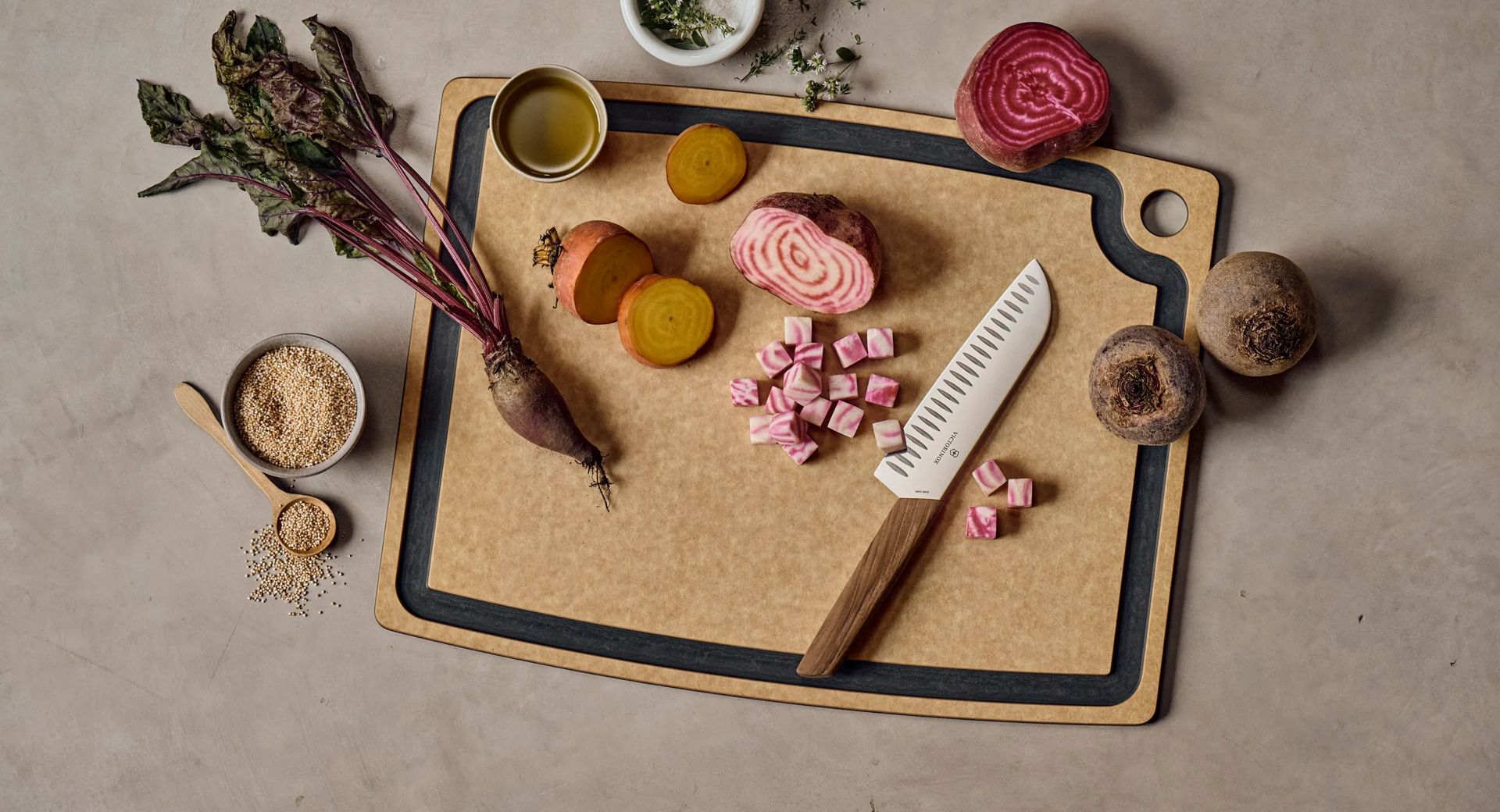 “Just as it’s absolutely crucial that ingredients for a meal are both top quality and really fresh too, you need to think about not just expert blades, but great kitchen utensils as well. This means things like precision peelers that can skin a tomato and robust boards that go the distance.”