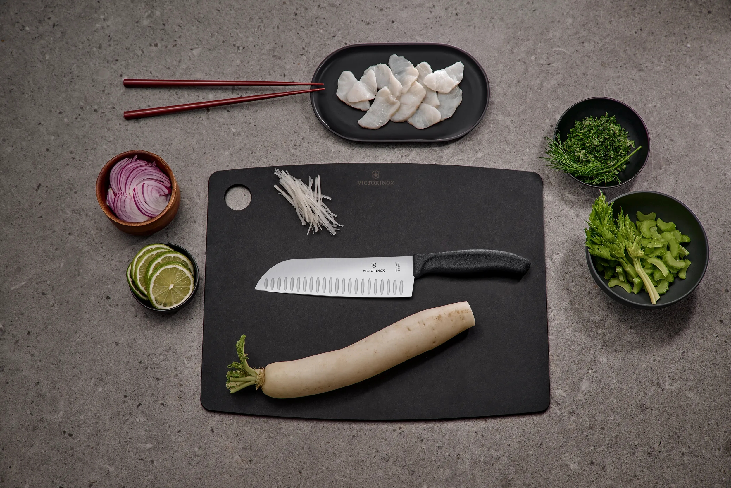 Le Couteau Santoku est la version japonaise du couteau de cuisine tous usages. Ce couteau est parfait pour trancher, découper en dés et émincer. Mais son plus grand talent est d’être polyvalent ; sa vraie spécialité, c’est de servir à tout.